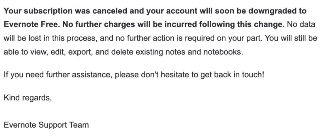 Let me go back to that hurried moment when I discovered the $249.99 charge on my credit card. When I went to cancel my Evernote subscription and request a refund. I received this email reply: