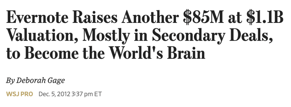 The total funding of Evernote stood at $247 million, according to the Wall Street Journal. The WSJ headline read that “Evernote raises another $85 million at a $1.1 billion valuation to become the “‘World's Brain.’”