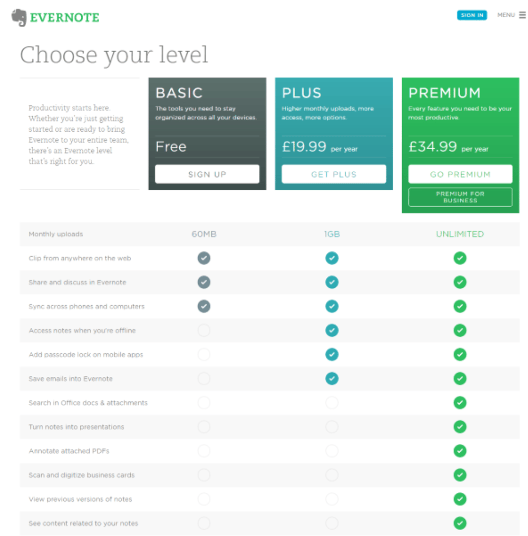 Specifically, pricing tiers that I see done well tend to be anchored in limits on features, not access to features themselves, as we will see that Evernote started with.